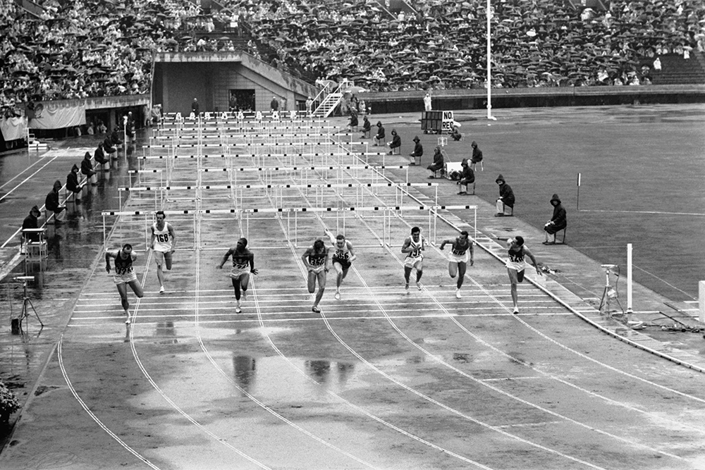 男子110mハードル準決勝2組で安田寛一(八幡製鉄)は雨の中、中盤までトップを争ったが後半に順位を落とし、14秒3(+0.3)の7着で及ばず。日本記録とは0.1秒遅れだった。ヘイズ・ジョーンズ(米国)が13秒6(+2.0)で制した。