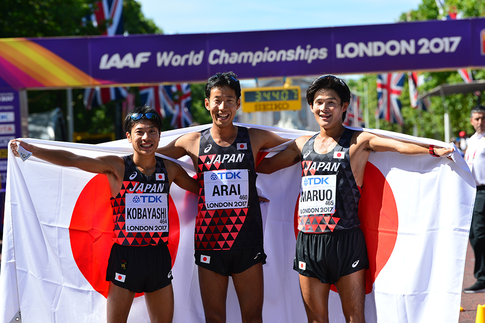 バッキンガム宮殿前の周回コースで行われたレースで、ヨアン・ディニ(フランス)が抜け出すなか、日本勢3選手は第2集団でレースを進める。36km付近で荒井が仕掛けると、小林がついて最後まで2位争いを繰り広げた。荒井はシーズンベストの3時間41分17秒、小林は自己ベストの3時間41分19秒をマーク。丸尾も3時間43分03秒の自己新。荒井は「プレッシャーのあるなかでメダルを獲得することができ、すごくいい世界選手権になった。それ以上に、50km競歩に参加した3名の選手が全員入賞したことが一番、素晴らしかった」と胸を張った。