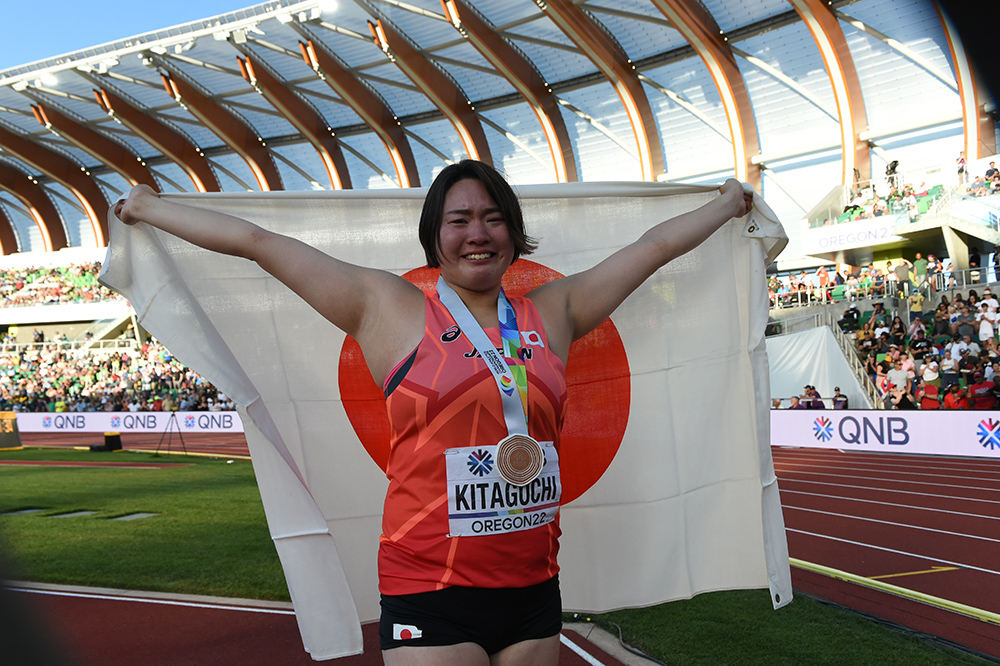 もう1人、快挙を成し遂げたのが女子やり投の北口榛花(JAL)だ。予選でサードベストとなる64m32を投げると、決勝では5位で迎えた最終試技で63m27を投げて3位に浮上。五輪も含めて女子フィールド種目で日本人がメダルを獲得するのは初めてのことだった。