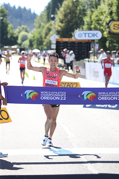 さらに、初めて実施された男子35km競歩では、川野将虎が2時間23分15秒のアジア新記録で銀メダルに輝いた。女子も20㎞で藤井菜々子(エディオン)が6位となり、ドーハ大会(7位)に続き2大会連続で入賞した。