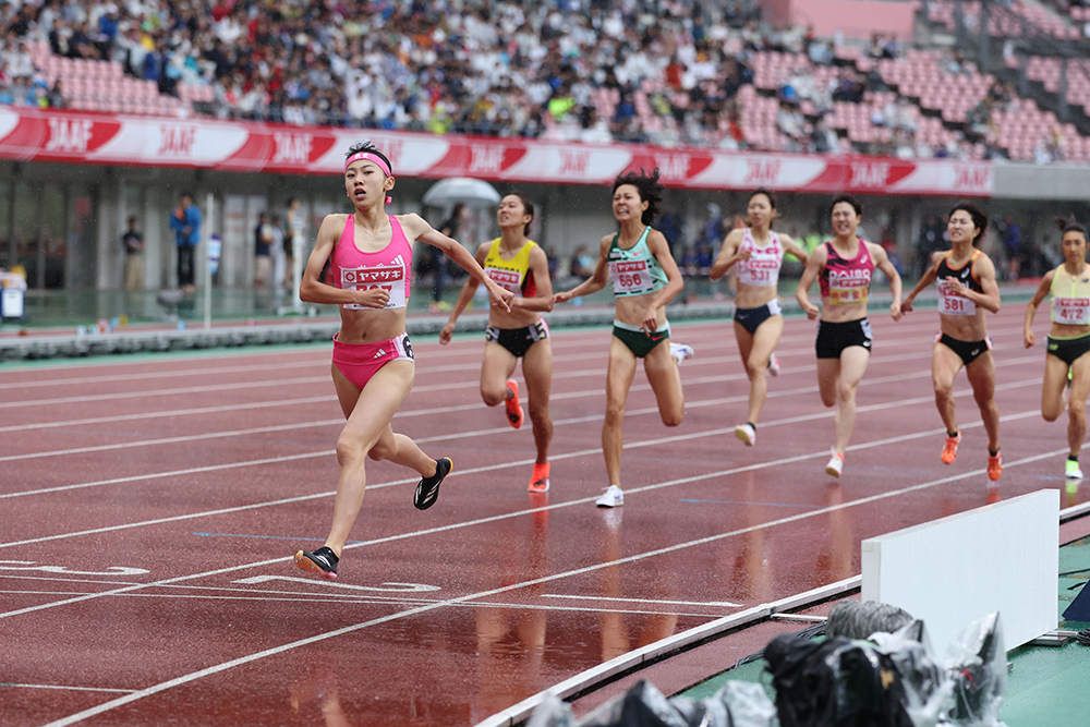 男女800mでは高校生チャンピオンが誕生。男子の落合晃(滋賀学園高)は予選でU20日本新・高校新となる1分45秒82をマークし、決勝も圧勝。だが、パリ五輪の参加標準(1分44秒70)を狙っていただけに、初優勝にも悔しさを口にした。女子の久保は冷静なレース運びで、自己記録を更新する2分03秒13で快勝した。