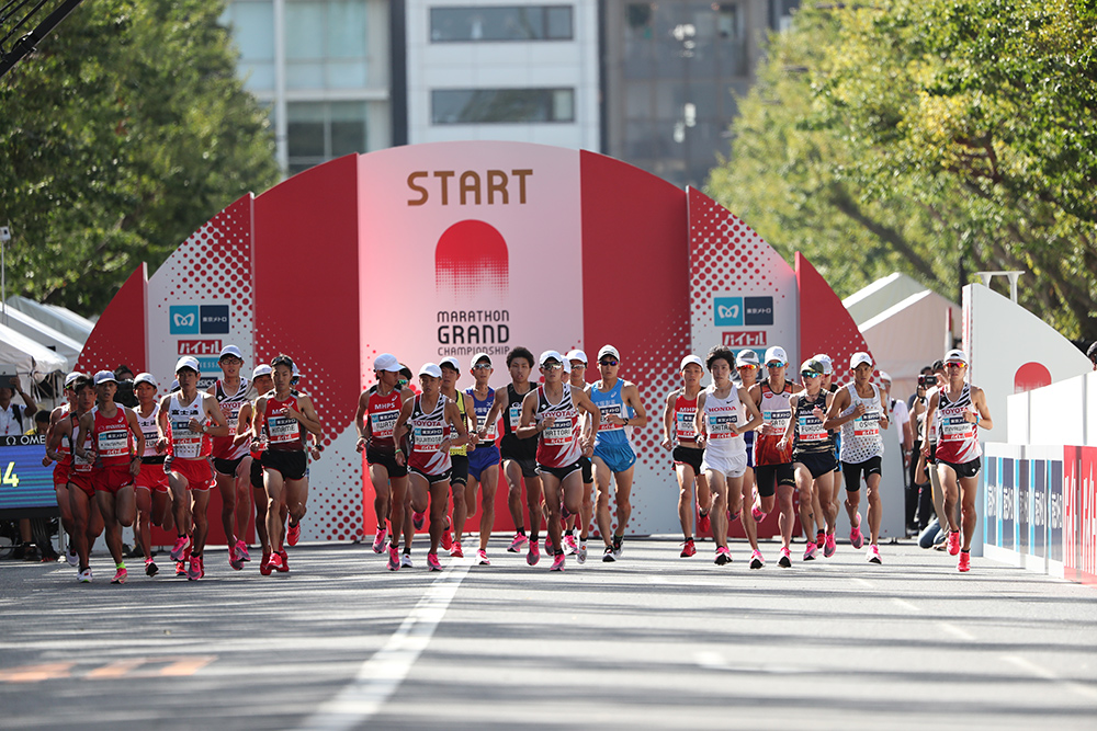 MGCへの出場権を懸けたMGCシリーズが2017年8月の北海道を皮切り、19年4月末まで行われ、男子34名、女子15名が出場権を獲得。そのうち男子男子31名、女子12名がエントリーし、棄権者が出てスタートラインに立ったのは男子30名、女子10名。東京・渋谷区の明治神宮外苑いちょう並木をスタート・フィニッシュとし、この発着点以外は東京五輪本番と同様のコースで行われた。早朝から気温がグングンと上がり、午前8時50分に男子、20分後に女子の〝決戦〟の始まりを告げる号砲が鳴り響き、選手たちは一斉に東京の街へ飛び出す。