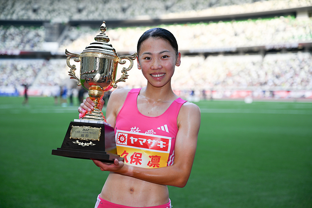 今大会唯一の日本新は女子800mで誕生。高校3年生の久保凛(東大阪大敬愛高)が、前年7月に出した日本人初の1分台である1分59秒93の日本記録を更新する1分59秒52を叩き出し、2連覇を成し遂げた。序盤から先頭に立ち、400mを58秒台で通過。その後はバックストレートで同じアジア選手権代表の塩見綾乃(岩谷産業)を突き放し、最後まで力強く走り抜いた。1分台を出してからは、「いざ試合となると、標準記録や連覇を考えてしまって緊張もありました」と苦しさを吐露する。それでも今回、現地まで応援に駆けつけた家族に背中を押され、世界選手権と同じ会場で「レースを楽しむことができました」と笑顔で振り返った。