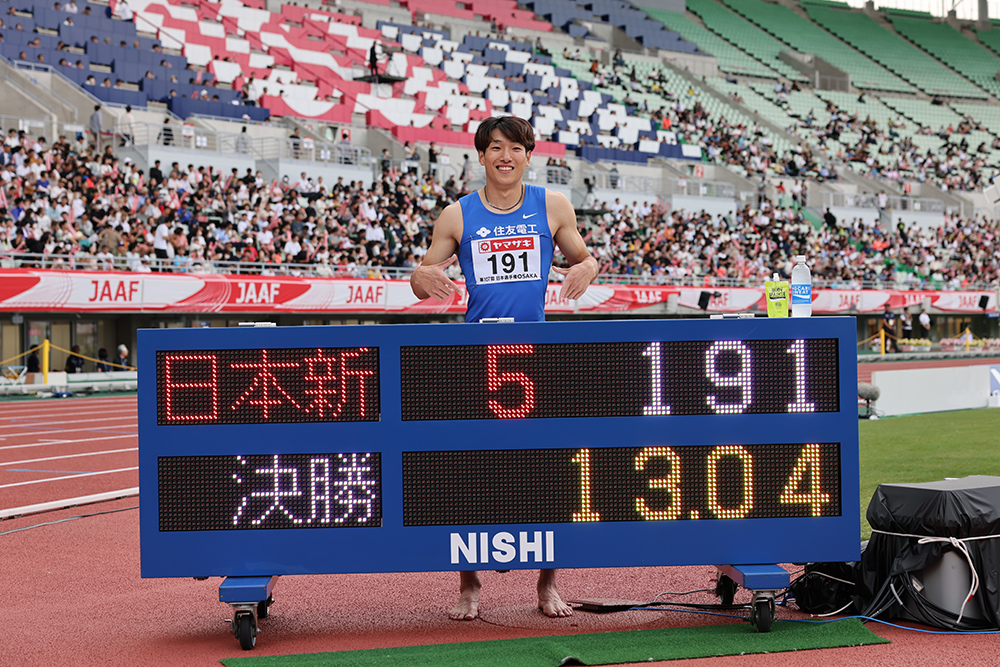 圧巻のパフォーマンスを見せたのが男子110mハードルの泉谷駿介(住友電工)。2年前に自身が作った日本記録・大会記録を0.02秒短縮する13秒04(-0.9)で3連覇を達成した。2年前と同じ舞台で、向かい風0.9mの条件。その中で今季世界リスト2位に入る大記録に、泉谷は「12秒台を出したかった気持ちもありますが、向かい風ならいいかな、と。自信になります」と力強くうなずく。21年の東京五輪、22年のオレゴン世界選手権は、いずれもセミファイナルに進出したが、日本人初の決勝の舞台にはあと一歩届いていない。5月のセイコーゴールデングランプリでも13秒07(+0.8)と13秒0台を複数回出しており、日本人初の12秒台、世界のファイナルで戦うという目標へ。機は熟しつつある。