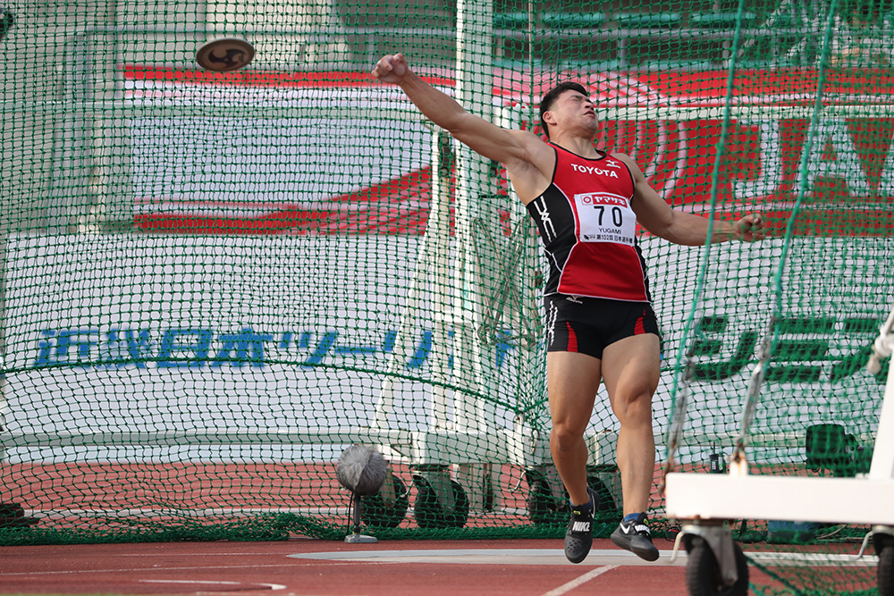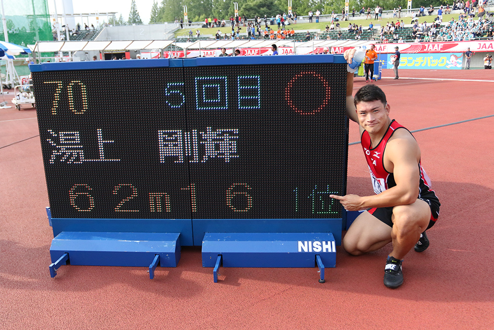 円盤投では湯上剛輝(トヨタ自動車)が5投連続の自己新、3投目の61m02から、62m03、62m16と3投連続で日本記録を塗り替える圧巻のシリーズで初優勝を飾り、「今日は60mを超えたら上出来だと思っていましたが、62mなんて信じられない気持ちです」。先天性の難聴を抱え、日常生活では補聴器を装着。昨年7月にはデフリンピックで銀メダルを獲得していた。