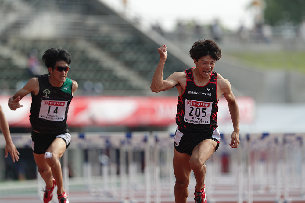 男女のスプリントハードルでは、そろって大会タイ記録が誕生。男子110mハードルは金井大旺(ミズノ)が自身の日本記録に並ぶ13秒36(-0.1)で2年ぶり優勝を飾った。前回は準決勝で不正スタートのため失格となり、ドーハ世界選手権代表入りを逃した。自身が不在だったレースで、高山峻野(ゼンリン)と泉谷駿介(順大)が2年前に金井が出した日本記録に並ぶ13秒36の「同タイム着差あり」という熱戦を演じている。その雪辱を果たし、「2年前は120%の力が出た限界の走り。今回はこれ以上いける感覚がある。まったく違う13秒36だと思います」と語り、胸を張った。